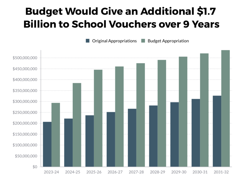 The budget significantly increases funding for vouchers to account for this expansion. For the current biennium, funding for the program increases to over $678 million (approximately $293.5 million in 23-24 and $384.5 million in 24-25), compared to the $428 million in appropriations outlined in the 2021 budget. If this funding were instead allocated to public schools, the budget could more than double teacher raises for the biennium. By 2029, over $500 million annually in taxpayer dollars will be allocated to private schools.