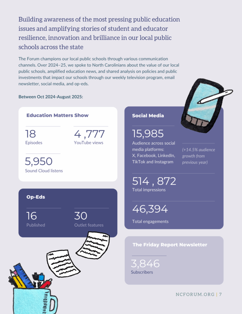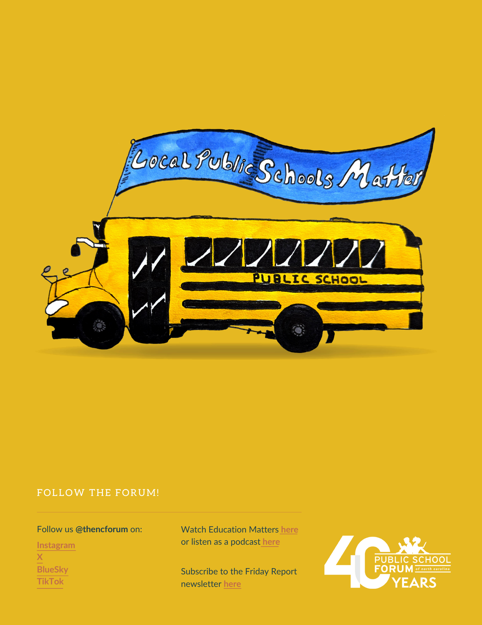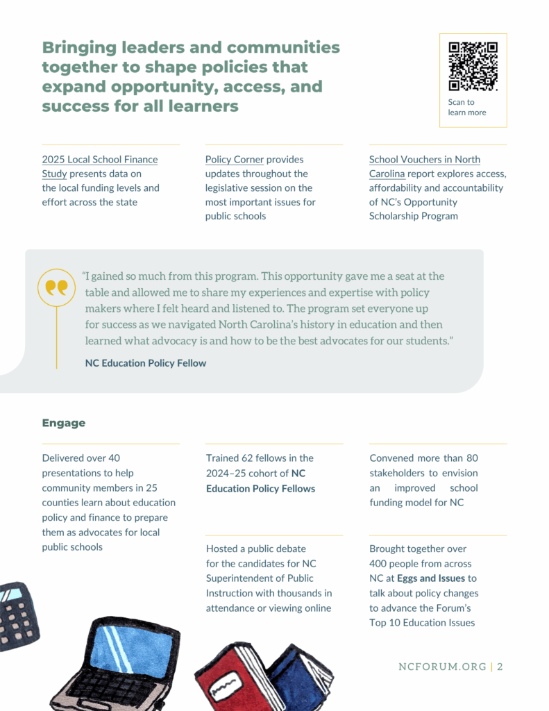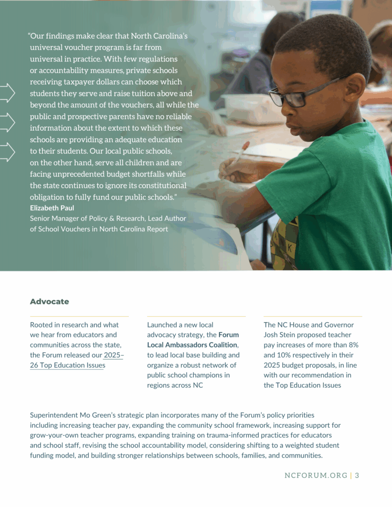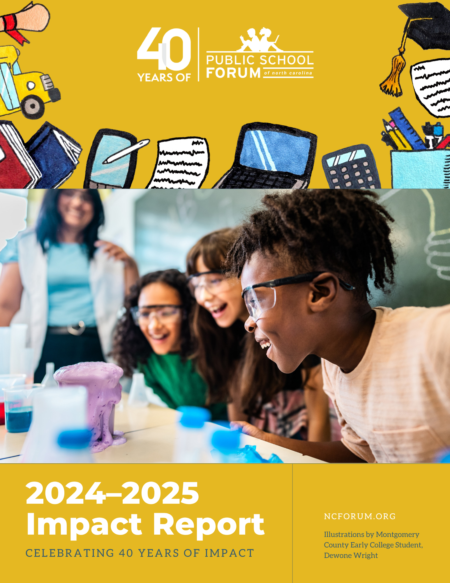 The Public School Forum of NC remains an indispensable champion of better public schools and the most trusted source in the state for research and analysis on vital education issues. We engage communities, legislators, business leaders, and educators to inform, build consensus, and drive action to shape education policy that centers on the needs and success of students.