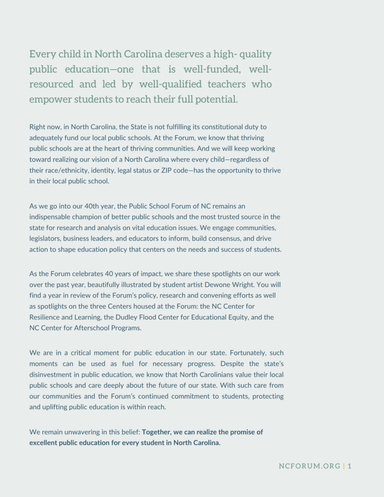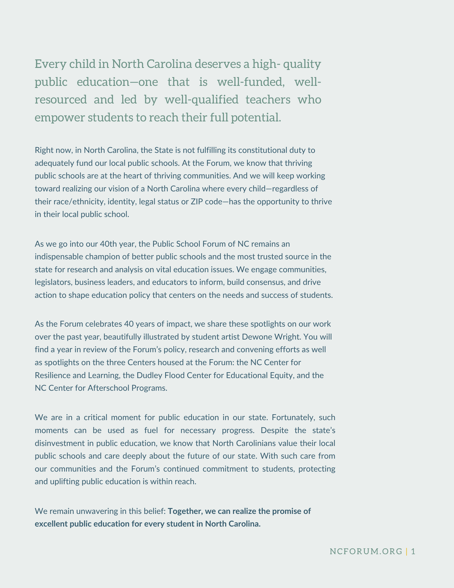 As the Forum celebrates 40 years of impact, we share these spotlights on our work over the past year, beautifully illustrated by student artist Dewone Wright. You will find a year in review of the Forum’s policy, research and convening efforts as well as spotlights on the three Centers housed at the Forum: the NC Center for Resilience and Learning, the Dudley Flood Center for Educational Equity, and the NC Center for Afterschool Programs.