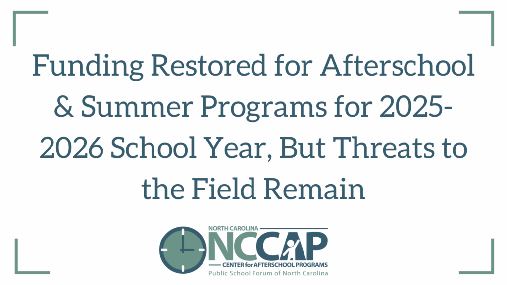 The North Carolina Center for Afterschool Programs (NC CAP), afterschool providers, and families across North Carolina are relieved that the funding for 2025-2026 21st Century Community Learning Center afterschool and […]