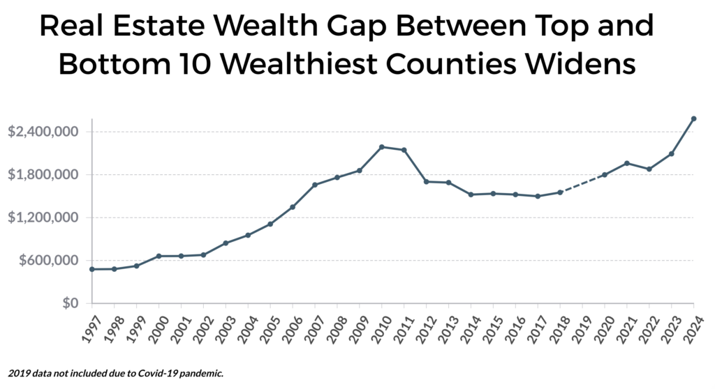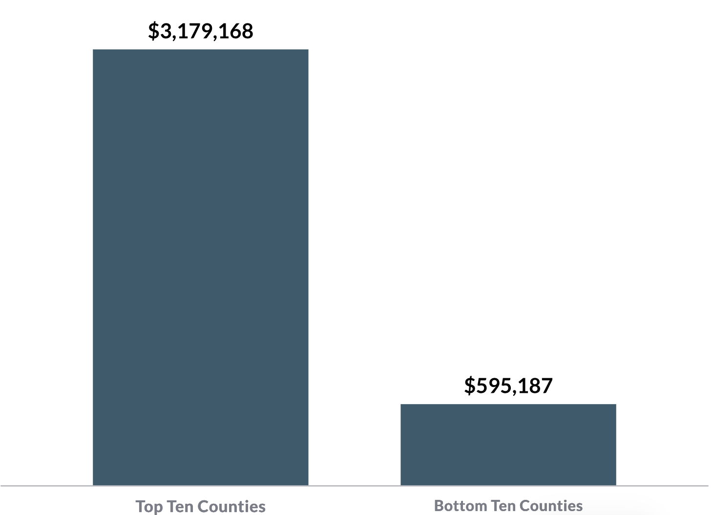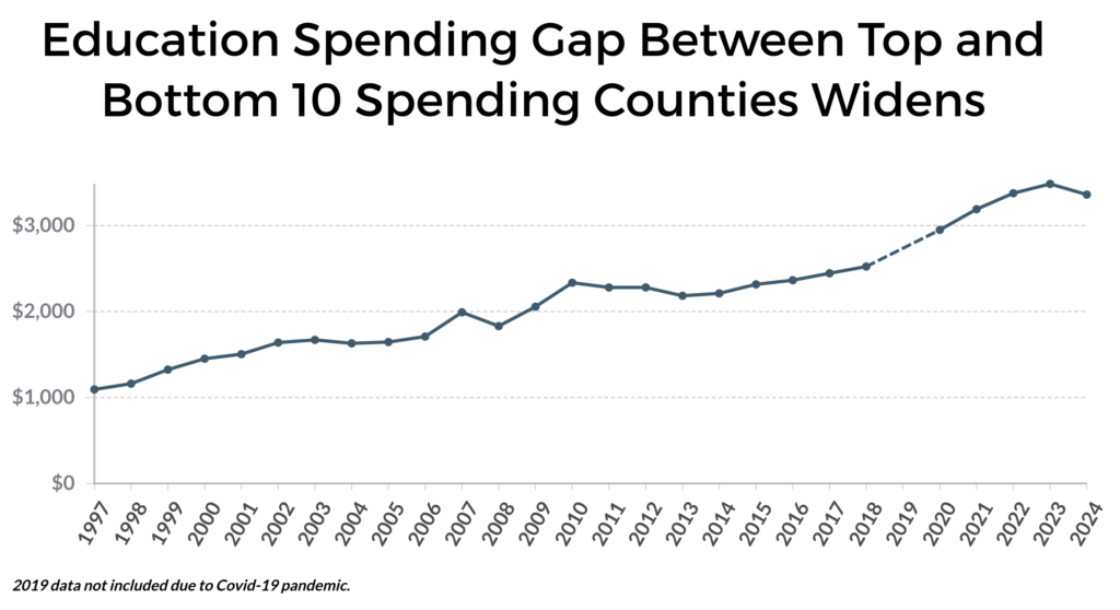 In 2023-24, the top 10 wealthiest counties had a tax base $2,583,981 greater than the 10 poorest counties. At the same time, the ten highest spending counties spent on average $4,391 per student compared to $1,031 by the ten lowest spending counties, a gap of $3,360 per student.
